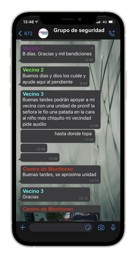 En los grupos de Seguridad de whatsapp se encuentran ciudadanos de cada colonia quienes colaboran reportando situaciones de riesgo en su sector. En cada grupo se encuentran agregados todos los Mandos de Policía, incluidos el Comisionado de Seguridad y el Centro de Monitoreo para garantizar que cada reporte sea recibido y atendido lo más rápido posible.